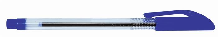 Jednorazové guľôčkové pero s priehľadným čírym telom, so zakončením a uzáverom vo farbe náplne. Modrá farba a priemer 1,0 mm.