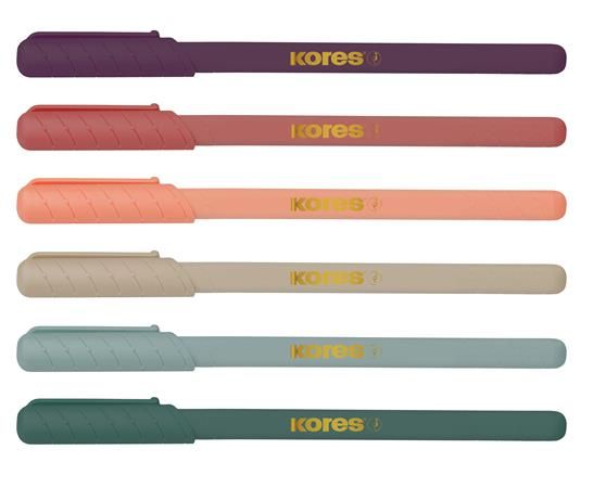 KORES inšpiruje vašu kreativitu a podnecuje vašu predstavivosť, preto sú jej produkty ideálnou voľbou pre všetky vekové kategórie, či už v škole alebo doma. -guľôčkové pero s guľôčkou z karbidu volfrámu -pologélový atrament, spája jemnosť gélových pier s odolnosťou guľôčkových pier -pogumovaný povrch -ergonomický, trojhranný dizajn -telo pera vo "vintage" farbe -priedušný systém zabraňuje úniku atramentu -ventilačný uzáver - jednorazové