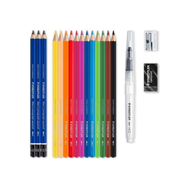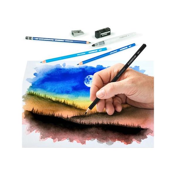 sada obsahuje: 12 rôznych farieb akvarelových ceruziek, 3 akvarelové grafitové ceruzky rôznej tvrdosti (4B, 6B, 8B), gumu, strúhadlo, vodou naplniteľný štetec