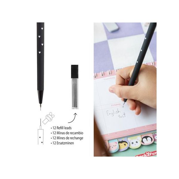 Pentelka s náhradnými náplňami v samotnom tele ceruzky, od značky M&G Tvrdosť grafitu je HB a priemer tuhy je 2 mm. Ceruzka funguje na princípe Multi-Point.