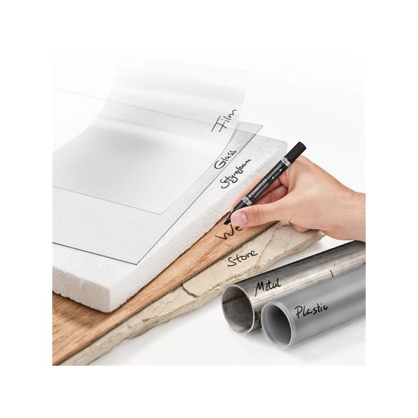 Permanentný popisovač - čierny. Píše na väčšinu povrchov - píše na papier, gumu, kožu, plasty, kovy. Odolá vode, oteru, poveternostným vplyvom. Atrament na alkoholovej báze. Valcový hrot so šírkou stopy 2 mm.