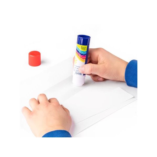 Biela polotuhá lepiaca tyčinka v plastovom obale s bezpečnostným uzáverom, vhodná na lepenie papiera, kartónu, lepenky. Netoxické a nezávadné zloženie založené na vodnej báze, hmotnosť 9 g.