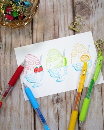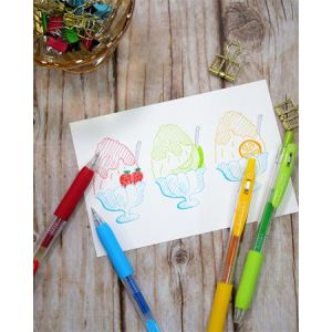 Gélové pero s transparentným plastovým telom, jednofarebným ergonomicky tvarovaným úchopom. Vymeniteľná gélová náplň modrej farby, šírka stopy 0,5 mm. Horná časť dekoračne potlačená detským motívom.