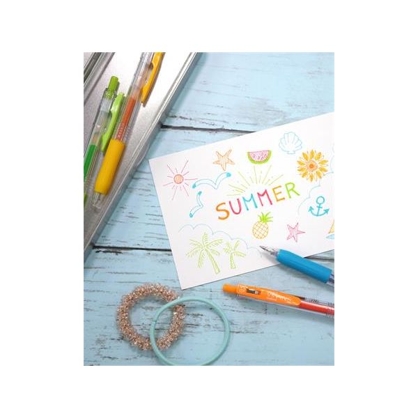 Gélové pero s transparentným plastovým telom, jednofarebným ergonomicky tvarovaným úchopom. Vymeniteľná gélová náplň modrej farby, šírka stopy 0,5 mm. Horná časť dekoračne potlačená detským motívom.