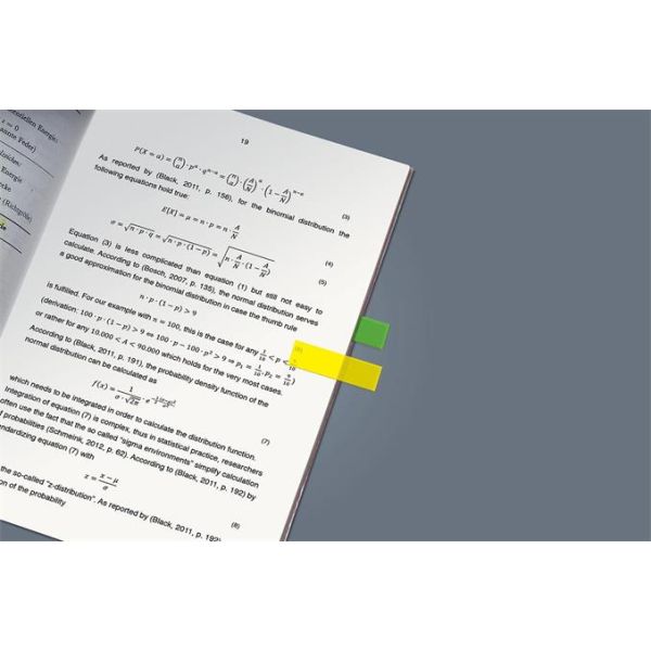 Záložky z PP hrúbky 60 mic. bez dispenzora, opakovane použiteľné, ultra tenké a popisovateľné. Rozmery 12 × 45 mm. Dodávané v mixe 5 farieb po 25 lístkov.