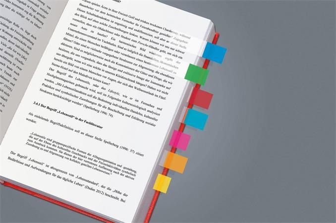 Celofarebné acetátové samolepiace záložky priehľadné po celej ploche. Nezakrývajú text a sú popisovateľné. Rozmery 12×45 a 12×42 mm. Neónové farby. Väčšie balenie 24 ks.