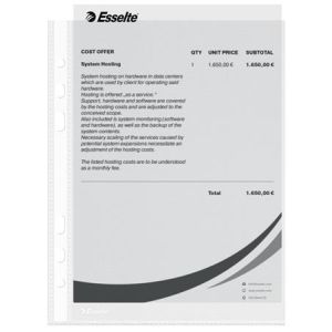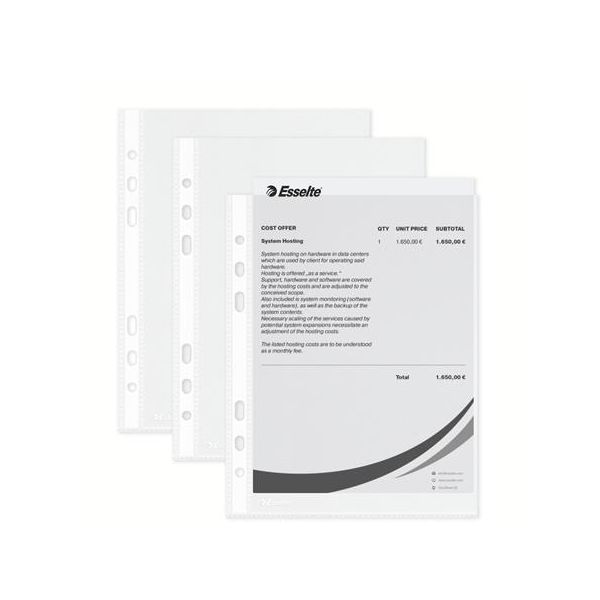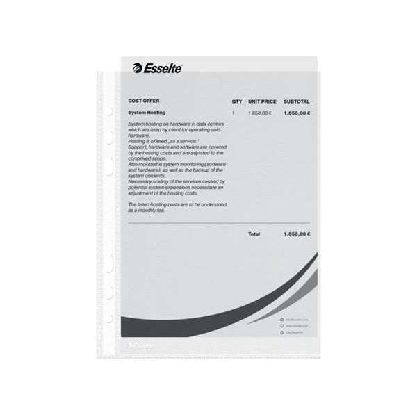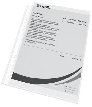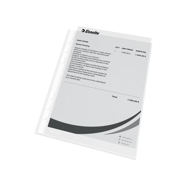 Priehľadný číry euroobal z polypropylénu. Otvor zhora, eurodierovanie, povrch lesklý a hladký. Formát A4.Balenie 10 ks v sáčku.