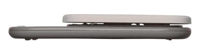Listová váha moderného dizajnu s veľkým displejom a predným zaoblením. Materiál plast, povrch strieborný matný. Vybavená jedným ovládacím tlačidlom, funkciou automatického vypnutia a automatického vynulovania, s prepínaním g / Ib / oz / ml. Súčasťou váhy sú 3 AAA batérie 1,5 V. Rozmery 160 × 230 × 18 mm.Technická špecifikácia:• váha nie je určená na použitiev platobnom styku• stupňovanie v 1-gramových krokoch• funkcia Tare• napájanie 3 ×1,5 V AAA batéria• rozmery vážiacej plochy 160 × 160 mm.
