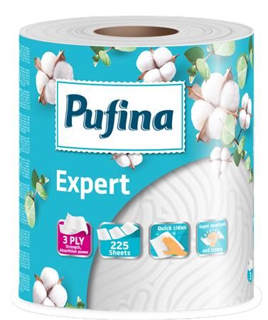 Papierové utierky, 3-vrstvové, 225 listov, 1 kotúč, PUFINA "Expert"