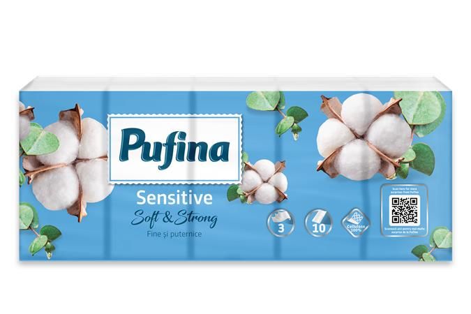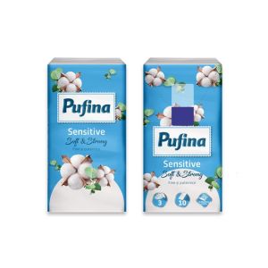 Papierové vreckovky, 3-vrstvové, 10×10 ks, PUFINA "Sensitive"