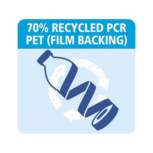 Lepiaca páska vyrobená zo 70% recyklovaných PET fliaš. - nosnosť do 30 kg - veľmi silná priľnavosť - vysoká pevnosť v ťahu - recyklovaný PET substrát (70%) - akrylátové lepidlo na vodnej báze - výrobný proces bez rozpúšťadiel