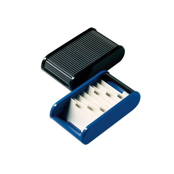 Priehľadný box na vizitky vyrobený z tvrdého plastu s praktickou doplnkovou funkciou: pri zatvorení bezpečne uchováva vložené vizitky a pri otvorení sa zmení na displej s vizitkami. Kapacita až 100 vizitiek (max. 86 × 56 mm). Vonkajšie rozmery (š × h × d) 95 × 60 × 30 mm.