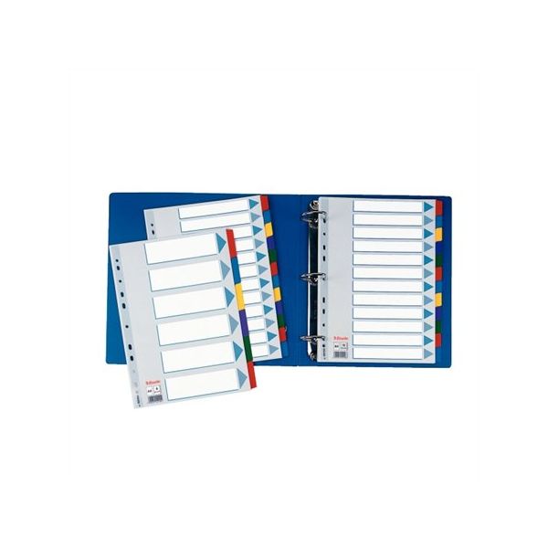 Celofarebný rozraďovač Esselte vyrobený z kartónu v rôznych farbách. Formát A4, eurodierovanie, popisovateľný titulný list na jasnú identifikáciu obsahu. Balenie jedna sada v polyesterovom sáčku. Väčšie balenie 20 sád.Formát: A4Popis: s titulným listom