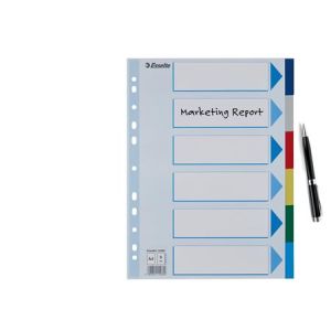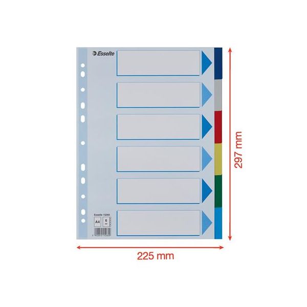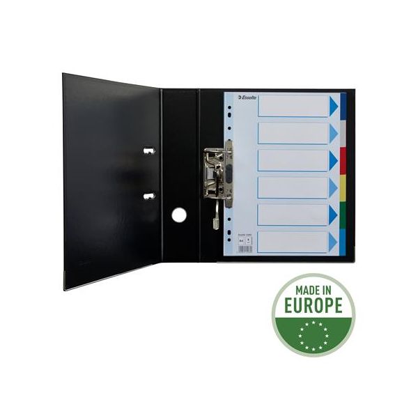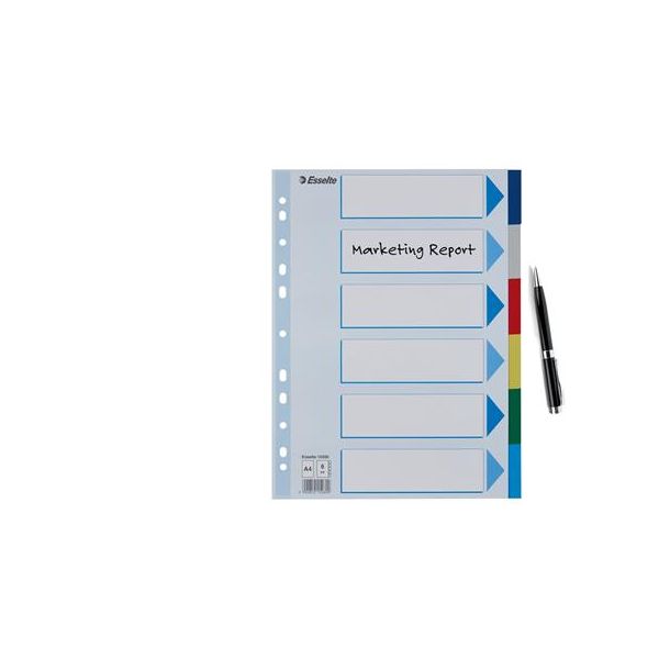 Celofarebný rozraďovač Esselte vyrobený z kartónu v rôznych farbách. Formát A4, eurodierovanie, popisovateľný titulný list na jasnú identifikáciu obsahu. Balenie jedna sada v polyesterovom sáčku. Väčšie balenie 20 sád.Formát: A4Popis: s titulným listom