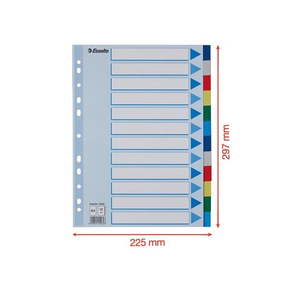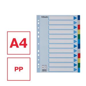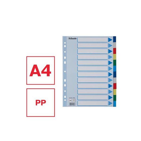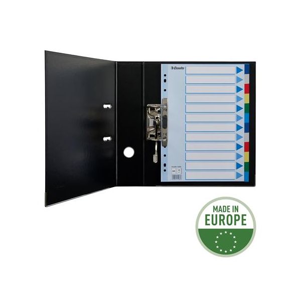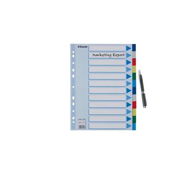 Celofarebný rozraďovač Esselte vyrobený z kartónu v rôznych farbách. Formát A4, eurodierovanie, popisovateľný titulný list na jasnú identifikáciu obsahu. Balenie jedna sada v polyesterovom sáčku. Väčšie balenie 20 sád.Formát: A4Popis: s titulným listom