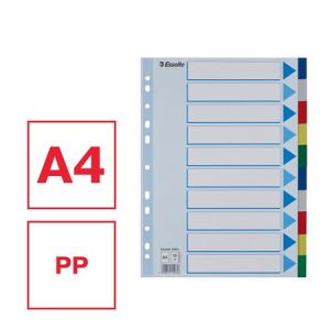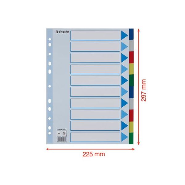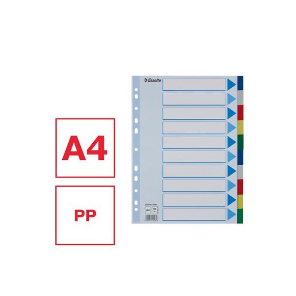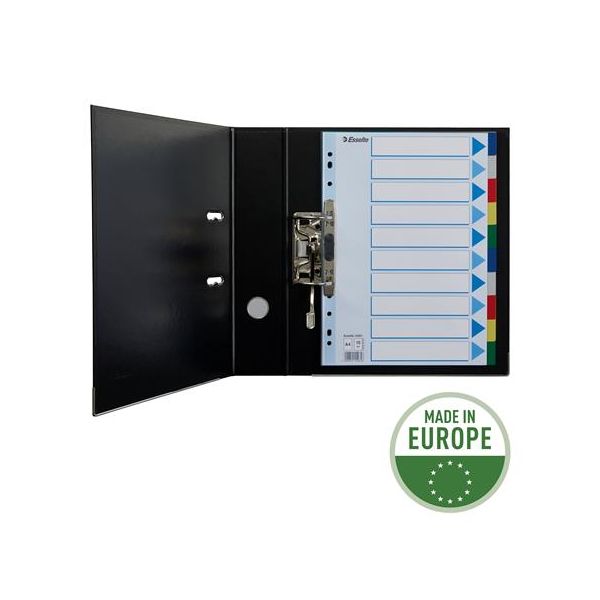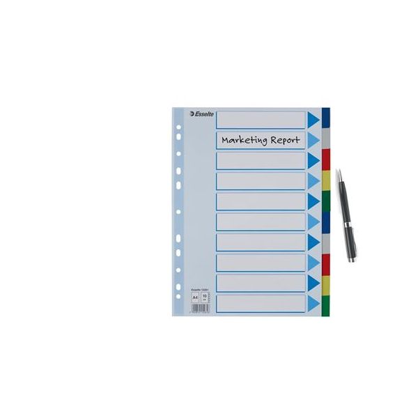 Celofarebný rozraďovač Esselte vyrobený z kartónu v rôznych farbách. Formát A4, eurodierovanie, popisovateľný titulný list na jasnú identifikáciu obsahu. Balenie jedna sada v polyesterovom sáčku. Väčšie balenie 20 sád.Formát: A4Popis: s titulným listom