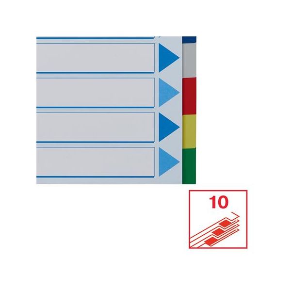 10-dielny A4 plastový farebný rozraďovač bez označenia s eurodierovaním a titulným listom na popisovanie obsahu. Balenie jedna sada v polyesterovom sáčku. Väčšie balenie 25 sád.