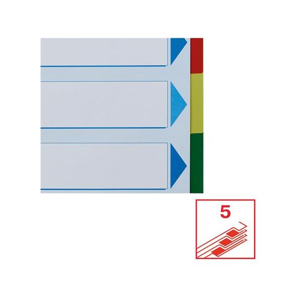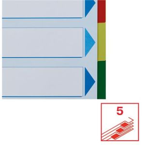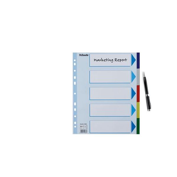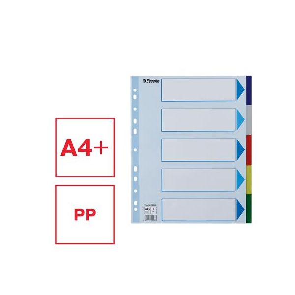 5-dielny A4 plastový farebný rozraďovač s eurodierovaním a titulným listom na popisovanie obsahu. Balenie jedna sada v polyesterovom sáčku. Väčšie balenie 25 sád.
