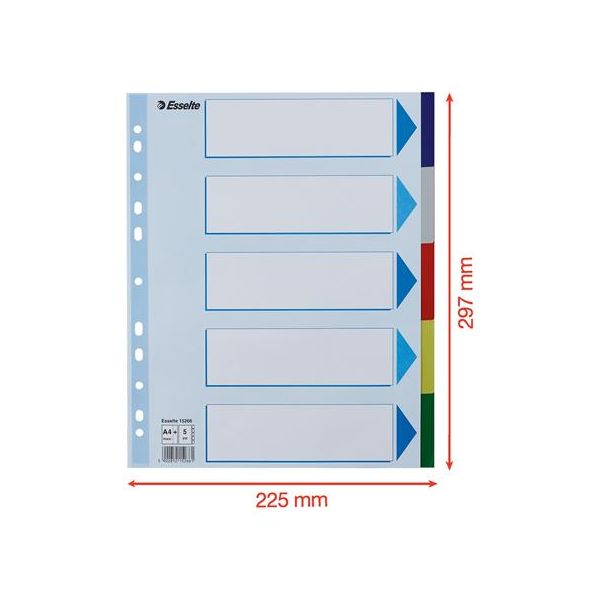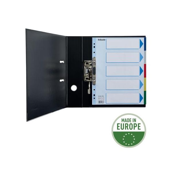Celofarebný rozraďovač Esselte vyrobený z kartónu v rôznych farbách. Formát A4, eurodierovanie, popisovateľný titulný list na jasnú identifikáciu obsahu. Balenie jedna sada v polyesterovom sáčku. Väčšie balenie 20 sád.Formát: A4Popis: s titulným listom