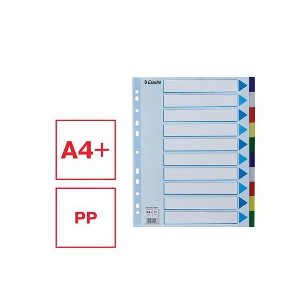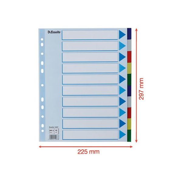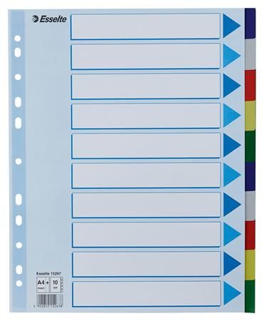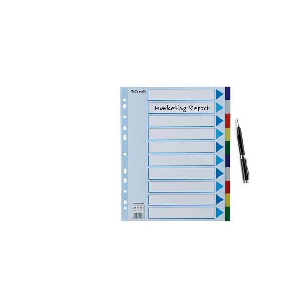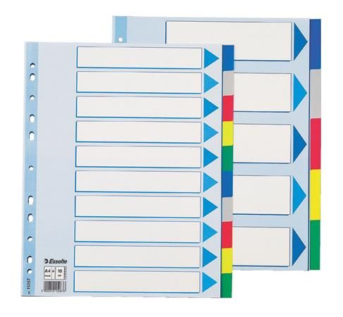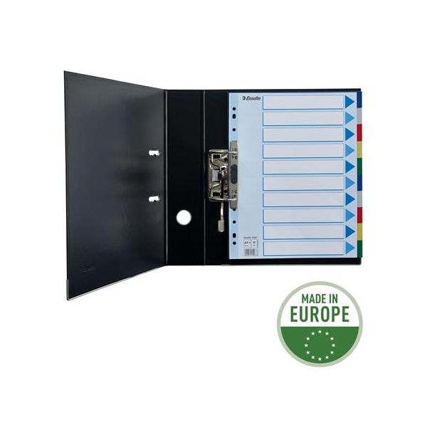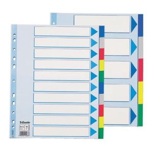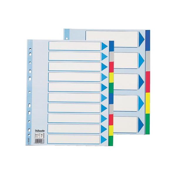 Celofarebný rozraďovač Esselte vyrobený z kartónu v rôznych farbách. Formát A4, eurodierovanie, popisovateľný titulný list na jasnú identifikáciu obsahu. Balenie jedna sada v polyesterovom sáčku. Väčšie balenie 20 sád.Formát: A4Popis: s titulným listom