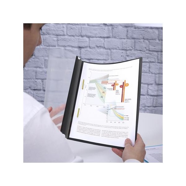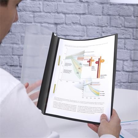 Plastový rýchloviazač vhodný na dokumenty formátu A4, s priehľadnou prednou stranou.
