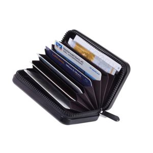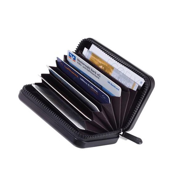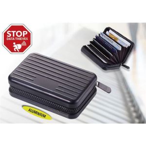 Uchovávajte svoje bankové karty v štýlovom puzdre s pevným obalom a dizajnom kufra. -rozmery: 70 x 105 x 30 mm -zapínanie na zips -materiál: hliník a polyester -RFID ochrana -9 priehradiek -kapacita: 20 kariet