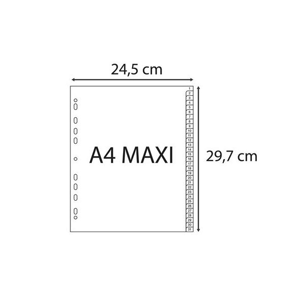 Číselný rozraďovač z polypropylénu. Formát A4, euro-dierovanie. Balenie jedna sada v polyesterovom sáčku. Väčšie balenie 25 sád. Farba sivá.Farba: siváFormát: A4