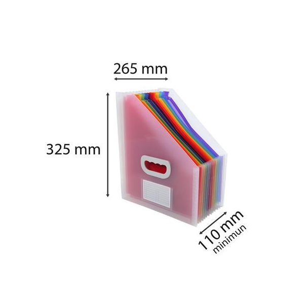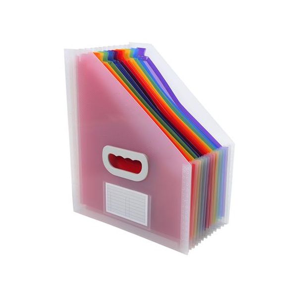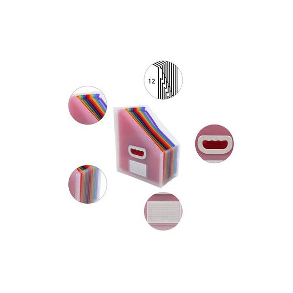 Veľkosť: A4Materiál: PPFarba: mixHarmonikové: ÁnoPočet priehradiek a vreciek: 12 ksIdeálne riešenie na rozdelenie dokumentov a časopisov. 12 farebných priehradiek vrecko na vizitky pod rukoväťou…