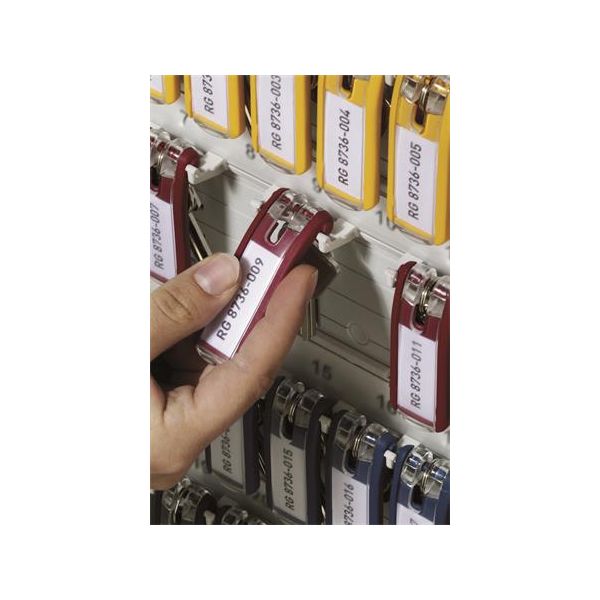 Tento jedinečný plastový prívesok na kľúče umožňuje dokonalý prehľad o kľúčoch v skrinke vďaka tomu, že kľúče sú na plocho uložené za kľúčenkou a popisovacie štítky sú tak kedykoľvek čitateľné. Kľúčenka je speciálne designovaná, aby bola zavesená na háčikoch a špeciálnych koľajniciach, jedine táto kombinácia zabezpečí, že kľúčenka visí nehybne na svojom mieste. Pre vloženie popisovacieho štítku možno klip ľahko otvoriť bez nutnosti zbavenia sa závesného krúžku. Na uľahčenie popisu slúži bezplatný softvér na www.durable.de. KEY CLIP - Kľúčenka je v ponuke v štyroch atraktívnych farbách (žltá, červená, modrá a čierna) - farbu nie je možné vybrať.
