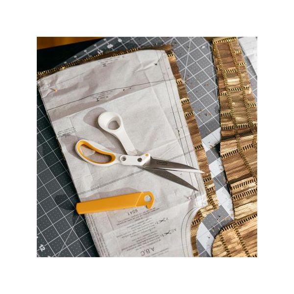 - Nožnice na látky Fiskars Amplify™ umožňujú presné a čisté rezy viacerých vrstiev látok alebo hrubých tkanín, ako je koža, čalúnenie, vinyl, vrecovina, semiš, flanel a ďalšie