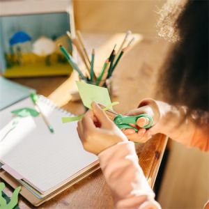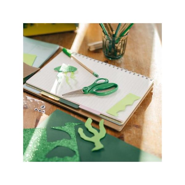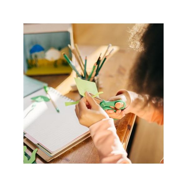 Nožnice MILAN Basic s čepeľou z nehrdzavejúcej ocele so zaoblenou špičkou. Plastová rukoväť. Ideálne pre použitie v škole. Farba zelená. 13,3 cm. Balenie: blister.