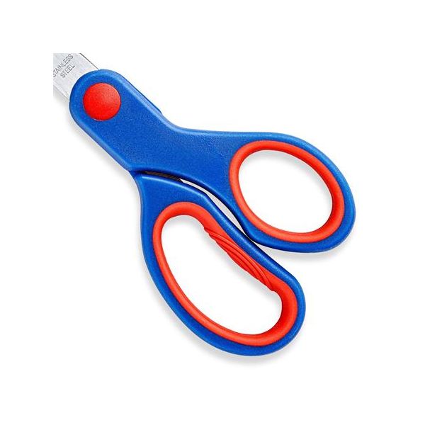 Školké nožnice s ergonomickou rukoväťou v troch pestrých farbách. Rukoväť je vyrobená z tvrdého ale zároveň na dotyk príjemného materiálu.Čepeľ nožníc je vyrobená z kvalitnej nerezovej ocele, pričom koniec čepele je zaoblený.