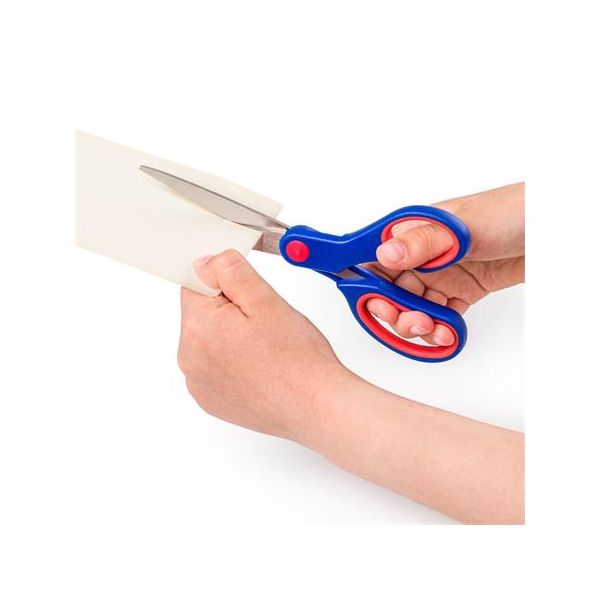 Nožnice s asymetrickými rukoväťami z PVC, dĺžka nožníc 165 mm, dodávané na blistri. Rozmer: 160x55mm, 75mm čepeľ.