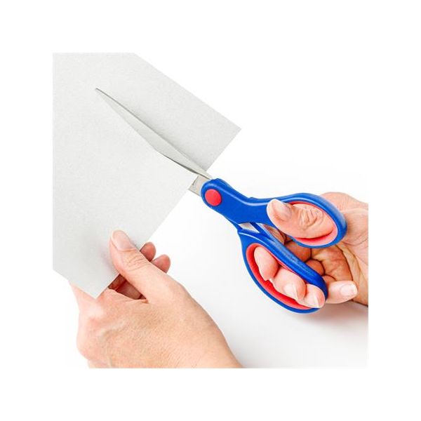 Nožnice s asymetrickými rukoväťami z PVC, dĺžka nožníc 165 mm, dodávané na blistri. Rozmer: 160x55mm, 75mm čepeľ.