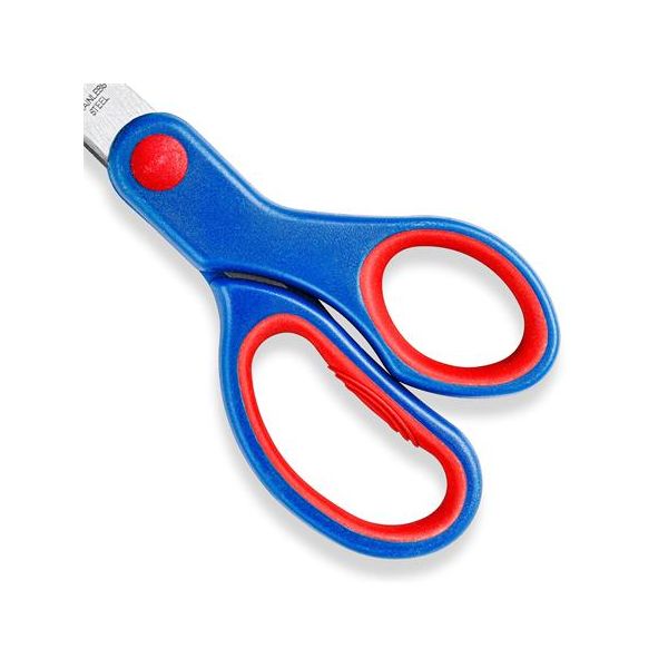 Školké nožnice s ergonomickou rukoväťou v troch pestrých farbách. Rukoväť je vyrobená z tvrdého ale zároveň na dotyk príjemného materiálu.Čepeľ nožníc je vyrobená z kvalitnej nerezovej ocele, pričom koniec čepele je zaoblený.