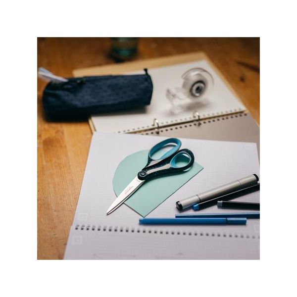 Školké nožnice s ergonomickou rukoväťou v troch pestrých farbách. Rukoväť je vyrobená z tvrdého ale zároveň na dotyk príjemného materiálu.Čepeľ nožníc je vyrobená z kvalitnej nerezovej ocele, pričom koniec čepele je zaoblený.