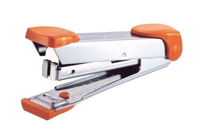 Odolná, kovová zošívačka s farebným plastovým tlačidlom (4 farby). výkon zošitia do 12 listov max hĺbka vloženia listov 50 mm náplň, spinky No 10 Cena je za 1 kus.