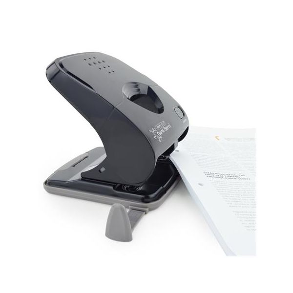 Kancelársky dierovač s posuvným pravítkom, materiál kov v kombinácii s plastom, rozpätie dier 8 cm, kapacita dierovania 12 listov. Priemer diery 5,5 cm.
