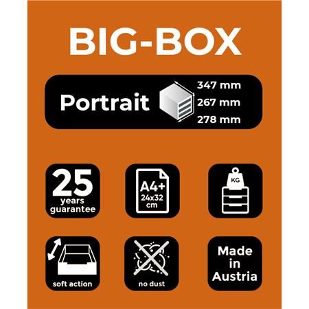 Box so štyrmi zatvorenými zásuvkami v tvare počítačového monitora.Rozmery (š × v × h) 294 × 235 × 368 mm.Farba boxu/zásuvky: sivá/červenáRozmery: 294x235x368 mm