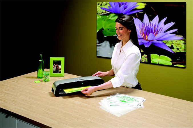 laminovací stroj na časté používanie, rýchlosť laminácie: 60 cm/min, stroj je za 60 s pripravený na laminovanie, základné balenie pre 10 dokumentov