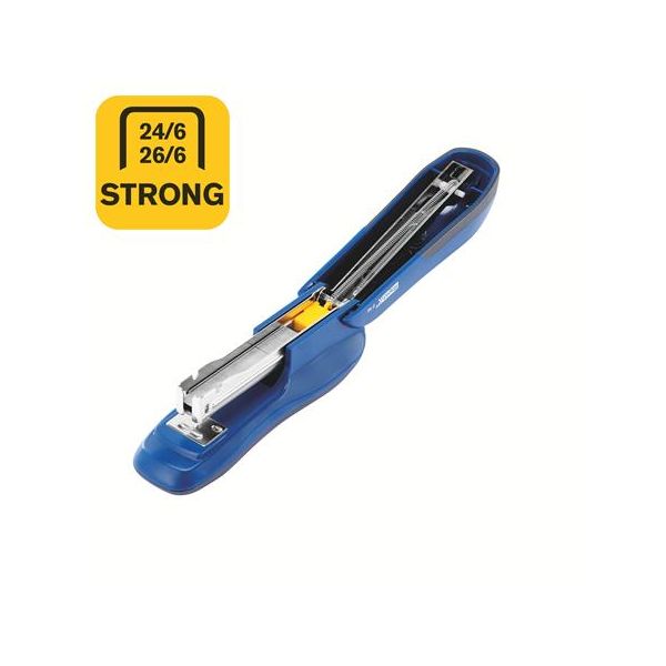 Zošívačka s polovičným plnením spiniek, oceľovým mechanizmom, kvalitným plastom ABS a gumou TPE. Módny ergonomický dizajn. Vhodná pre domácnosť aj kanceláriu.