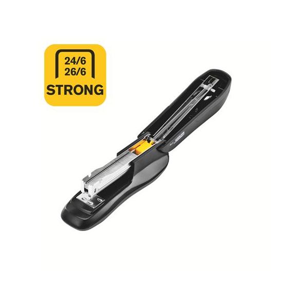 Zošívačka kovová v kombinácii s plastom. Výkon max 20 listov. Vhodná náplň veľkosti 24/6, 26/6, dodávaná v troch farebných prevedeniach. Materiál: kov + plast.