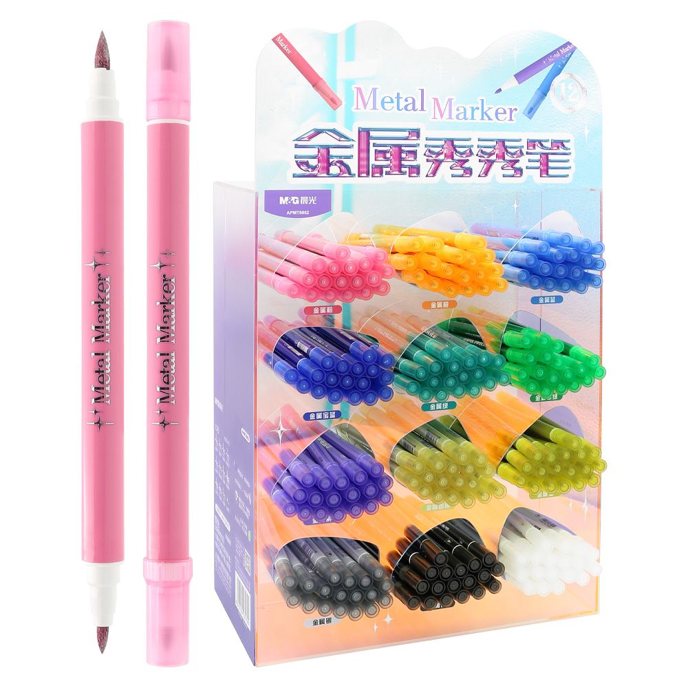 Plastový stojan + obojstranné fixy Metal Marker v 12-tich farbách po 18 ks. akrylový atrament, vhodné pre rôzne materiály (bezpečný a bez zápachu) sýte metalické farby, možno ich miešať,…