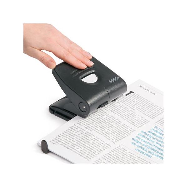 Kancelársky dierovač s posuvným pravítkom, materiál kov v kombinácii s plastom, rozpätie dier 8 cm, kapacita dierovania 12 listov. Priemer diery 5,5 cm.