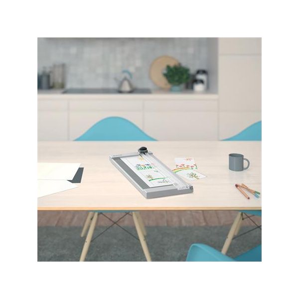 Prenosná rezačka s maximálnou dĺžkou rezu A5 (240 mm). Bezpečná a jednoduchá koliesková rezačka, s vymeniteľnými reznými lištami Výsuvné nástavné pravítko do formátu A4 Kapacita rezu až 5 listov (80 g / m2) A5 vodiace pravítko Záruka na stroj je 1 rok