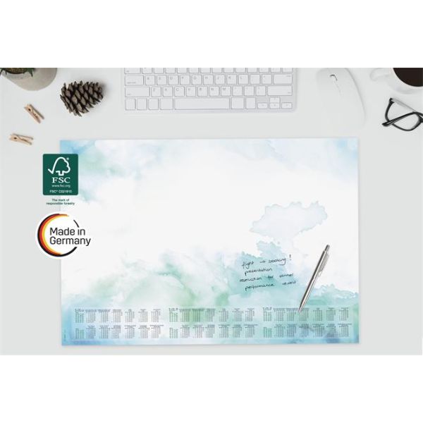 s trojročným kalendárom (2026/2027/2028) -s týždenným plánovačom -štvorjazyčný: angličtina, nemčina, francúzština a holandčina -veľkosť: približne A2 -odolný, protišmykový a vďaka masívnej kartónovej zadnej doske úplne rovno leží -použiteľný aj ako podložka pod myš -30 listov -farba: zelená, modrá -s certifikátom FSC