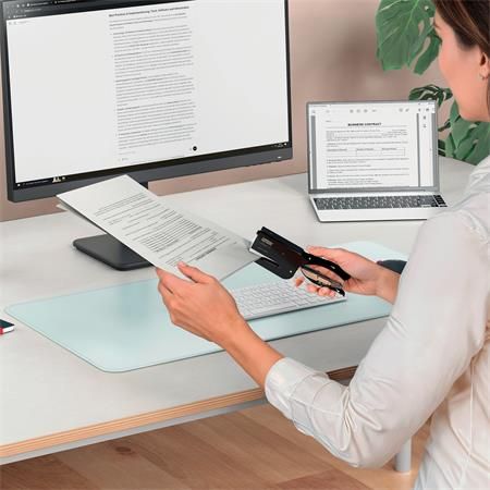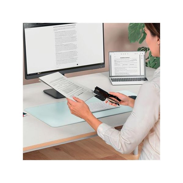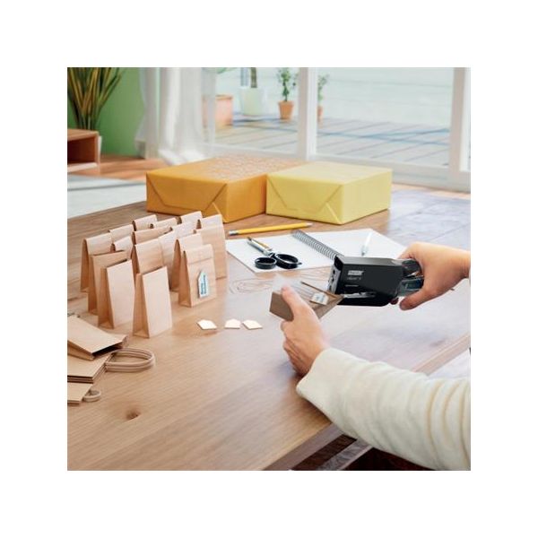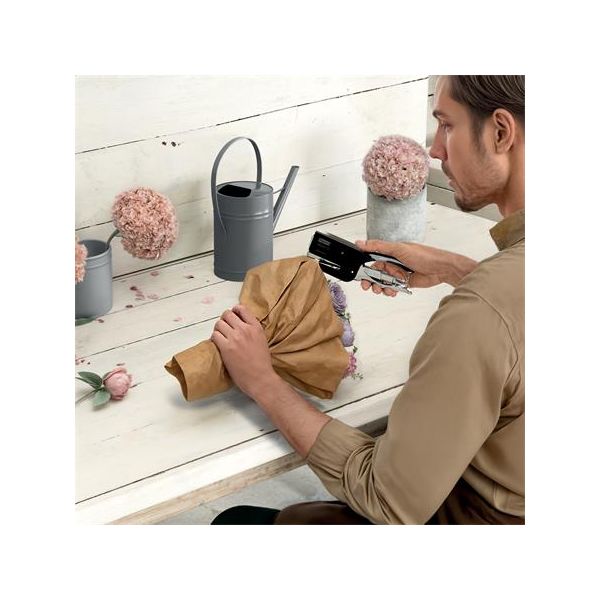 Plastová zošívačka s rozošívačkou, výkon zošitia až do 8 listov, vhodná náplň spiniek N.10. Dĺžka ramena: 50 mm