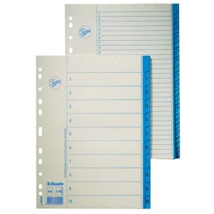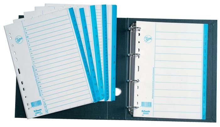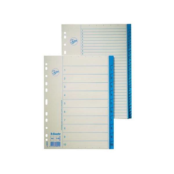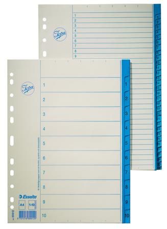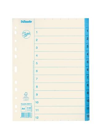 Celofarebný rozraďovač Esselte vyrobený z kartónu v rôznych farbách. Formát A4, eurodierovanie, popisovateľný titulný list na jasnú identifikáciu obsahu. Balenie jedna sada v polyesterovom sáčku. Väčšie balenie 20 sád.Formát: A4Popis: s titulným listom