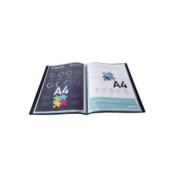 Katalógová kniha na prezentáciu materiálov formátu A4, (vkladanie zhora). - kniha obsahuje 20 transparentných PP obalov (0,04 mm) na vloženie dokumentov A4- hrúbka obalu 0,75 mm s papierovou etiketou na chrbtovej strane