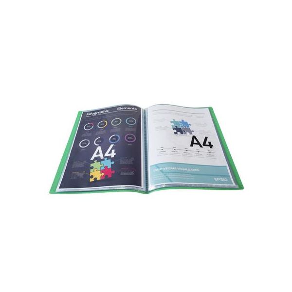 Katalógová kniha na prezentáciu materiálov formátu A4, (vkladanie zhora). - kniha obsahuje 20 transparentných PP obalov (0,04 mm) na vloženie dokumentov A4- hrúbka obalu 0,75 mm s papierovou etiketou na chrbtovej strane